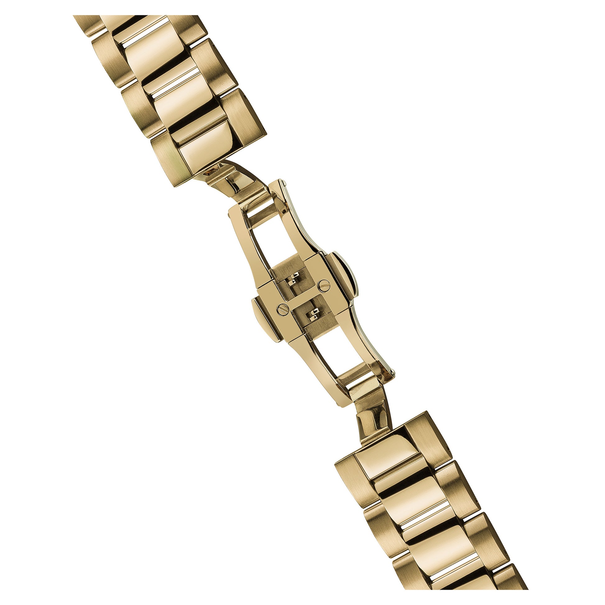 Informed by vintage styles, the Ingersoll The Jazz watch is a striking men’s watch with a brushed gold PVD stainless steel case measuring 42mm. It consists of a fixed polished bezel, angular lugs and a knurled crown at 3 o’clock. Scratch resistant mineral glass covers the case on the front, as well as on the back of the case through the exhibition caseback. The watch is powered by automatic movement and it is water resistant to 50 metres, which means that it is designed to withstand exposure to water and light moisture, but it is not suitable for activities that involve significant water pressure or submersion.