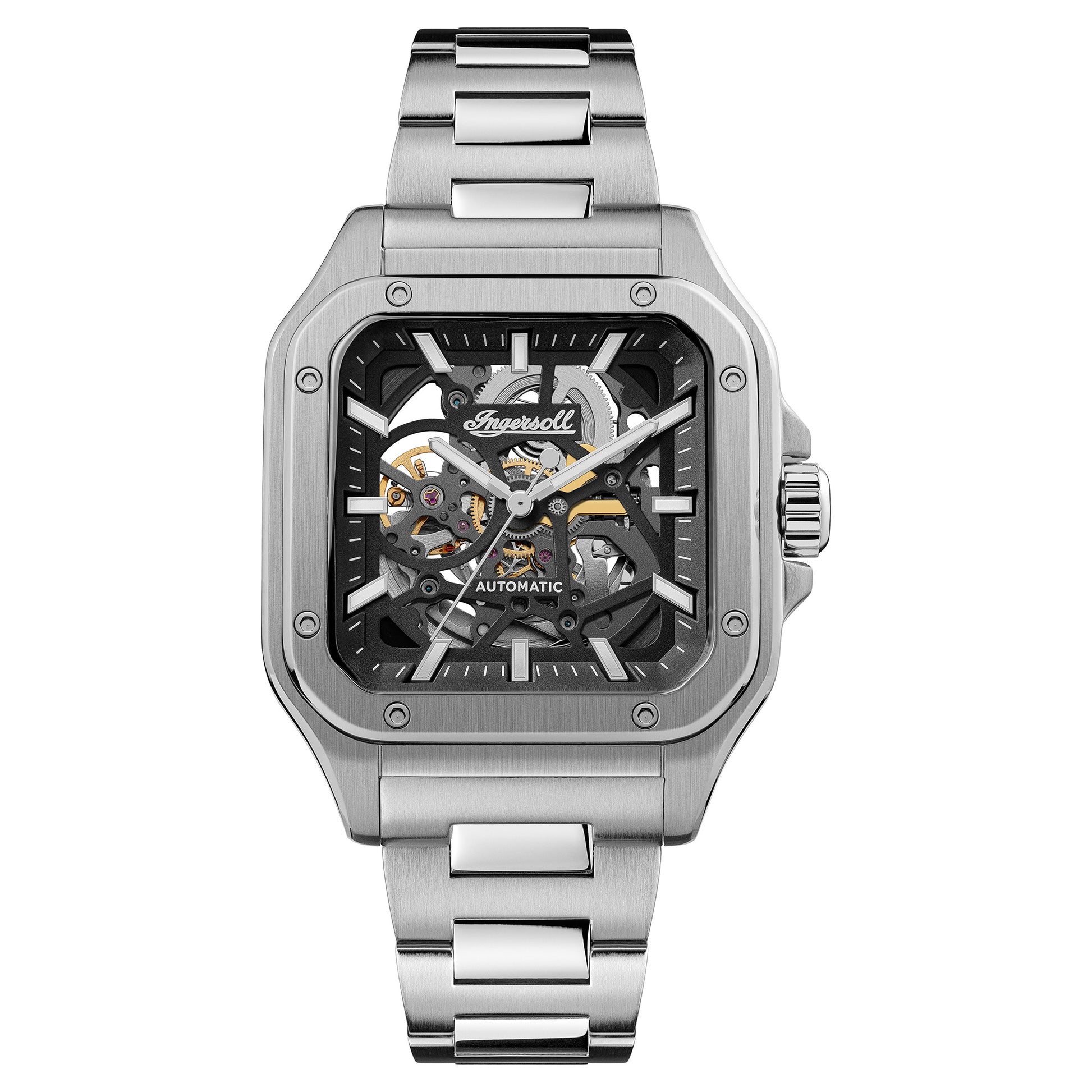The Ingersoll I14501 features a tank style stainless steel case that measures 42mm in width and 13.7mm in depth. The case consists of a fixed bezel that is secured to the body case through the eight screws. The watch is presented on a H-link stainless steel bracelet that is presented in silver/gunmetal grey and features a combination of brushed and polished finishes. It is powered by automatic movement and it is water resistant to 50 metres, which means that it is designed to withstand exposure to water and light moisture, but it is not suitable for activities that involve significant water pressure or submersion.