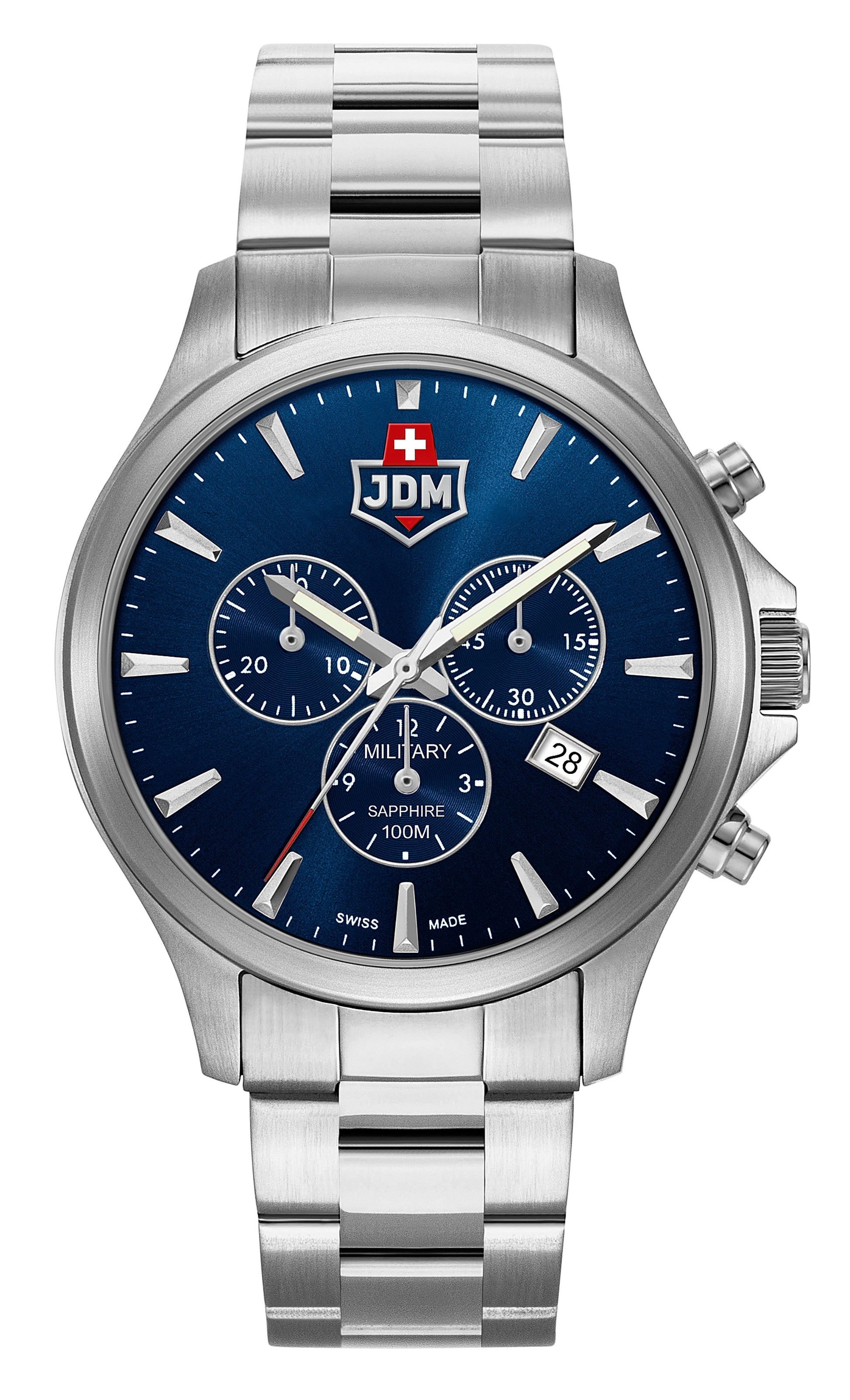 With the ALPHA CHRONO JDM launches a tough and reliable military watch designed for timekeeping under adverse physical conditions. The stainless steel case and bracelet score with high resistance to corrosion, impact, and harsh environmental conditions, meeting the specific requirements of military watches. The ALPHA CHRONO Swiss Made quartz movement is accurate at all times and functions in heat, cold, or high altitudes.