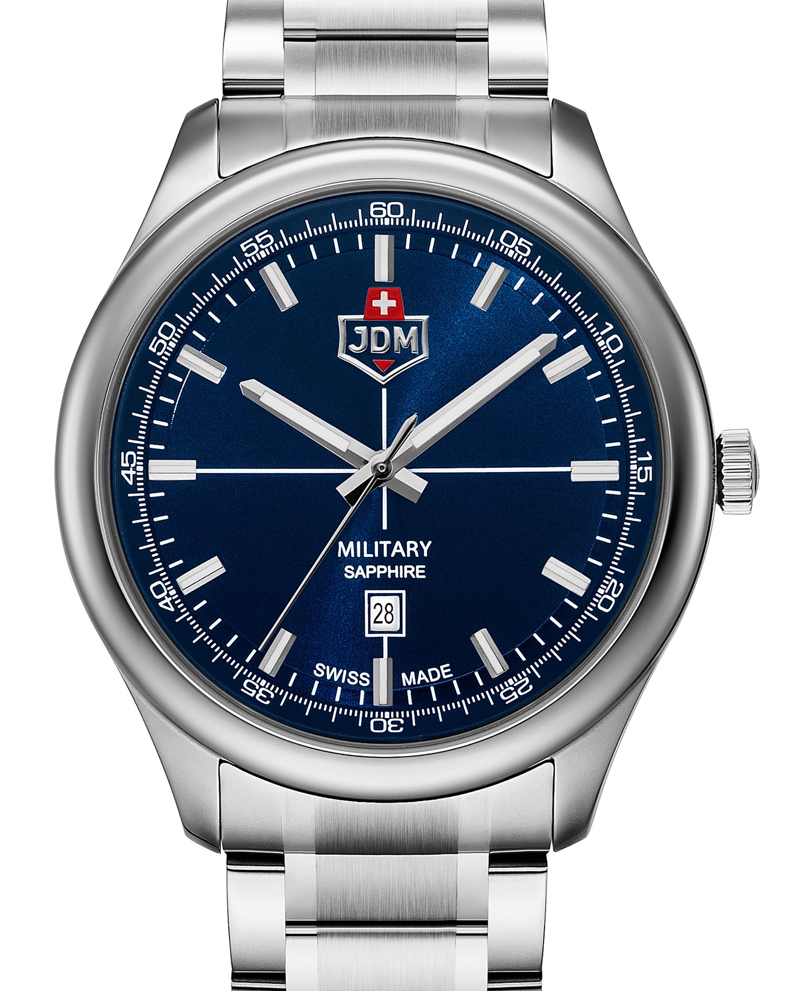 The dial layout features a dark gray, blue, green, or silver dial with a vertically interrupted central cross, partially luminescent hands and hour markers and the red and white Swiss Made JDM brand logo at 12 o‘clock. Date display and MILITARY SAPPHIRE lettering occupy the opposite position at 6 o‘clock. Matching the stainless steel case, the ALPHA MISSION models are worn on solid bracelets in pure steel for a classic finish.