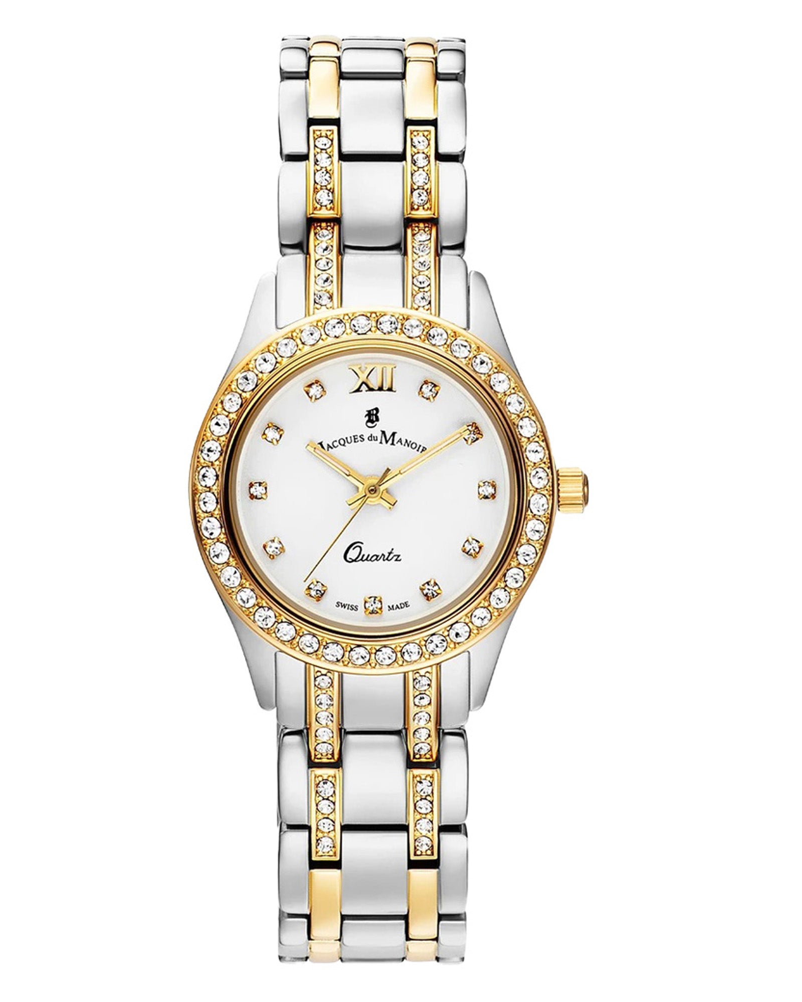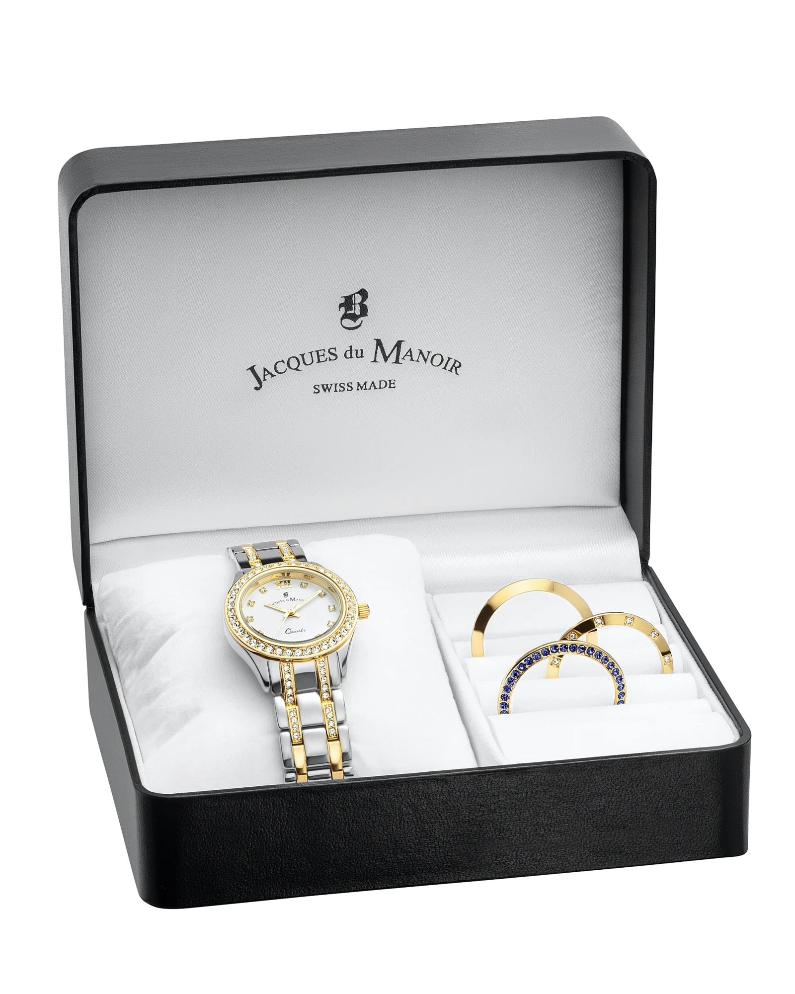 The ROYAL casts its spell on us with a truly majestic sparkle. JACQUES DU MANOIR’s “royal family” shines in 30 mm. The enchanting watch is protected by a dial window in durable mineral crystal. Case and bracelet of the ROYAL are made of gold plated metal. Bracelet and bezels are ornamented with sparkling zircon stones. Intelligent elegance is the magic word that characterizes the perfect timepiece for today’s princesses: Each of the elegant sets contains, in addition to this stunning watch, we offer three replaceable bezels, giving the charming ladies' watch a new look to match your outfit.