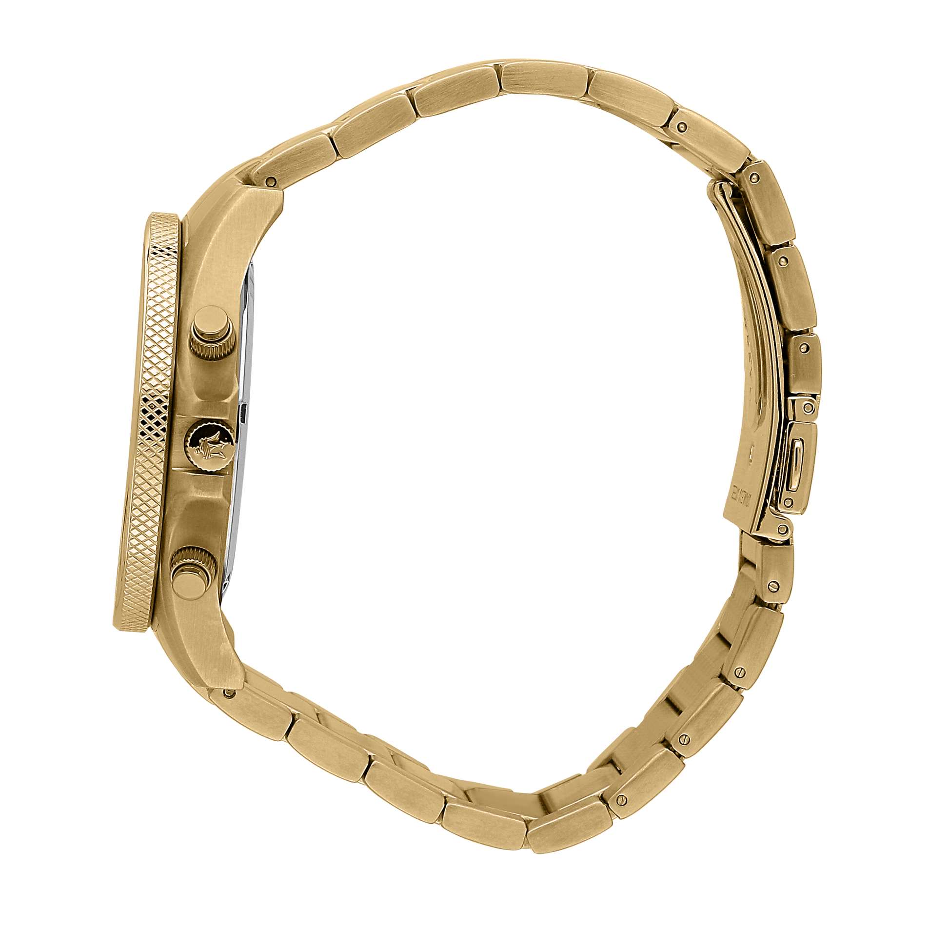 Presenting the Maserati Sfida 44mm Gold Chronograph Watch. The Maserati Sfida Collection consists of watches with sporty elegance, characterized by a structured design, steel case (44mm) with rotating or tachymeter bezel, knurling finish on one side. The sunray effect or modern dégradé dials offer elegance and rigour, distinctive features of Maserati maison. The new models from Sfida collection are based on Maserati's values and sporting heritage. Detailed watch constructions and colour nuances enhance the super luxury brand DNA.