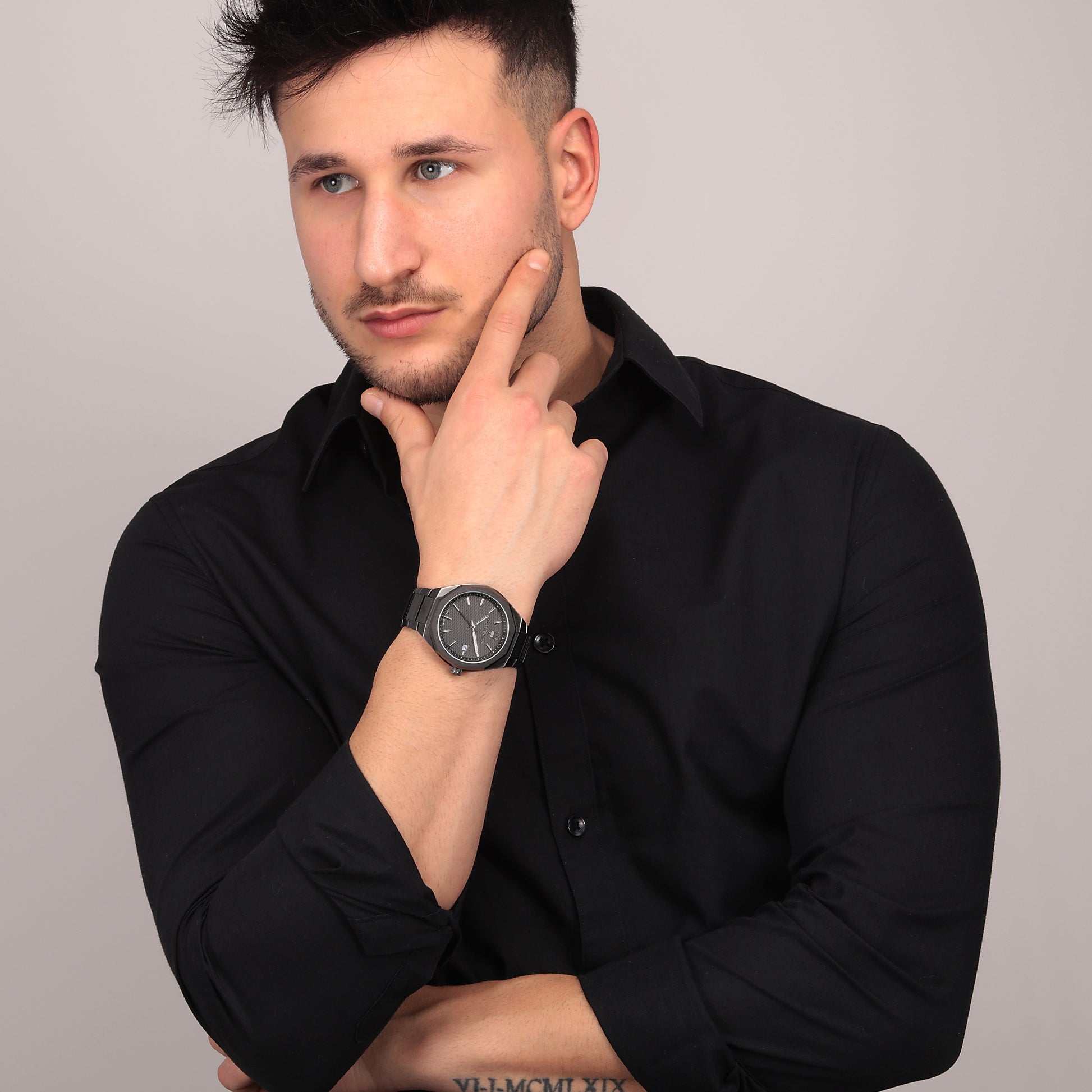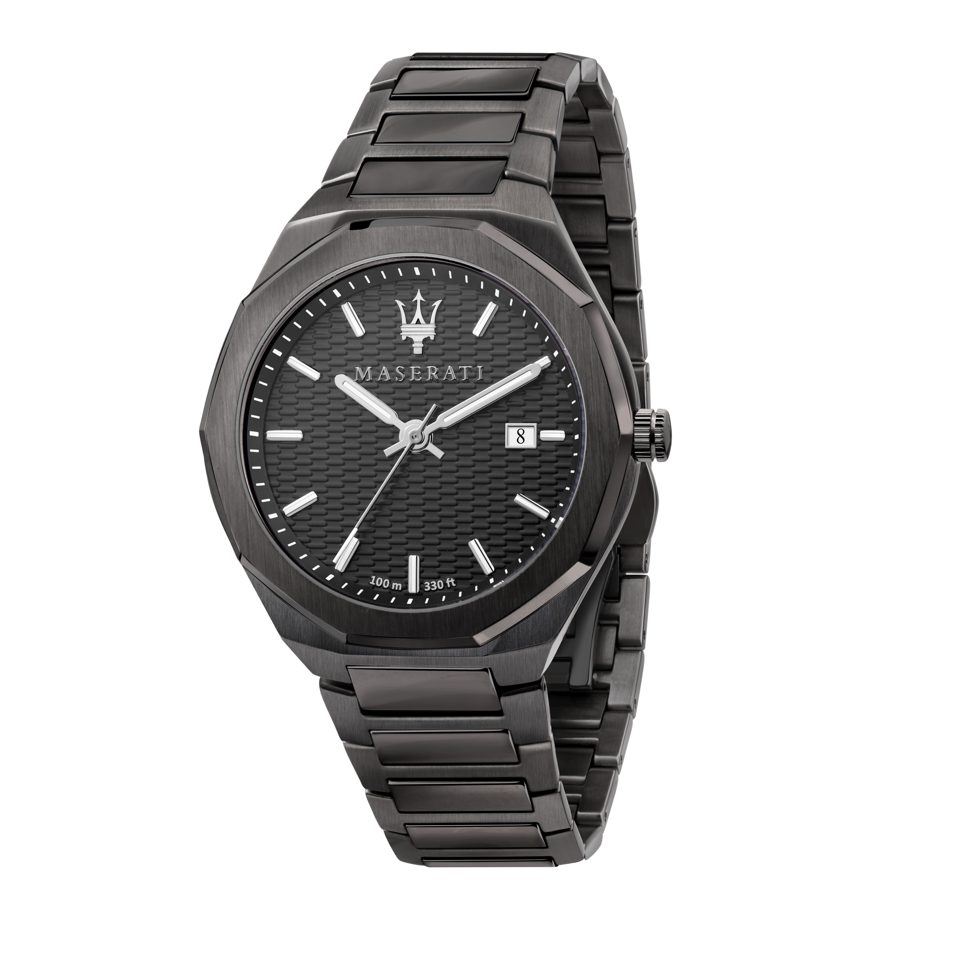 Presenting the Maserati Stile Gunmetal Watch. Welcome to the Maserati Stile Collection: watches that take up the mechanics, construction and stylistic codes of the iconic sporting watchmaking timepieces. The decisive lines, the distinctive decagonal bezel and the slim case are combined with details that strongly identify the sporting world such as: pump pushers, screw-down crown, multi-level dial, applied luminescent indexes, luminescent hands and a buckle with a personalised butterfly clasp featuring the applied Trident.- Materials: Stainless steel, Gun Metal PVD
