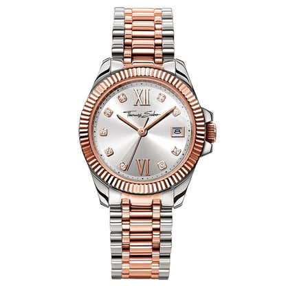 Dial/bands: 3 hands, silver-coloured sunray dial with white crystal stones as indexes