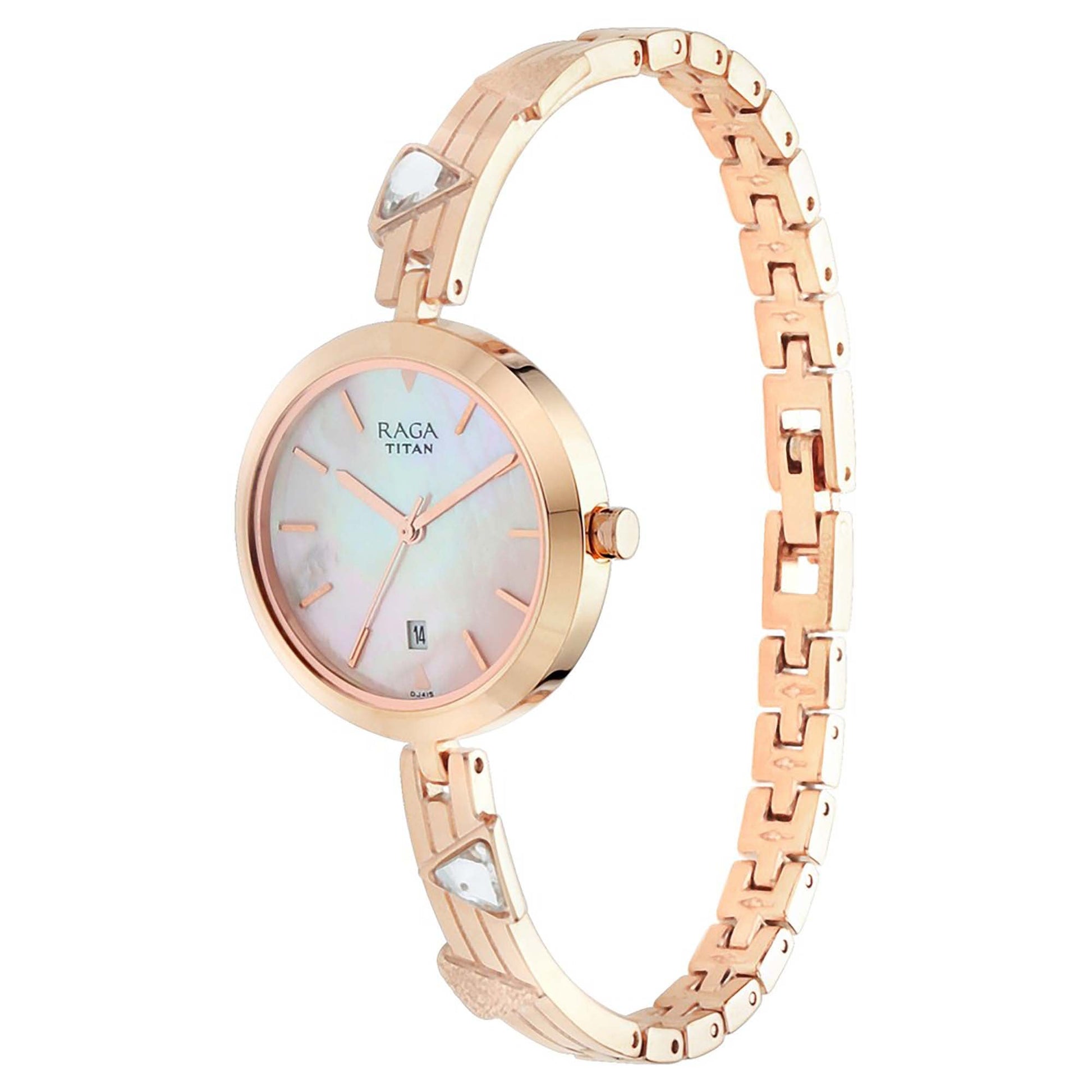 The Titan Raga Viva Quartz Analog Watch for Women features a luminous mother of pearl dial with a date function and a stylish rose gold metal strap. Its elegant design and radiant finish make it a sophisticated accessory for any occasion