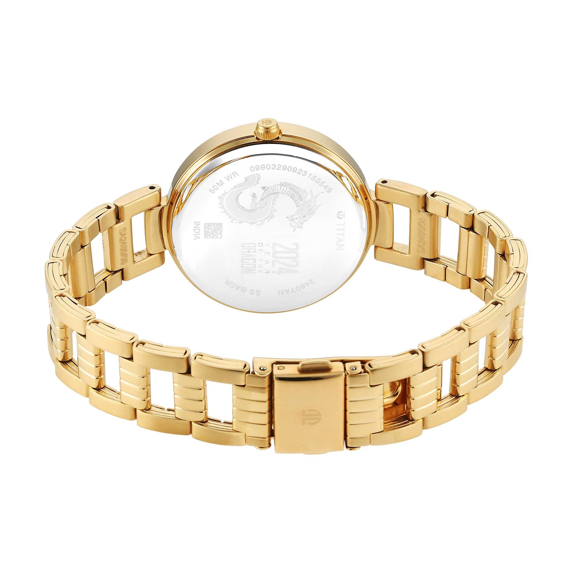Discover the Titan Tet Analog Watch with its vibrant red dial and sophisticated gold-colored stainless steel strap. This timepiece combines eye-catching style with a touch of class, perfect for enhancing your look.