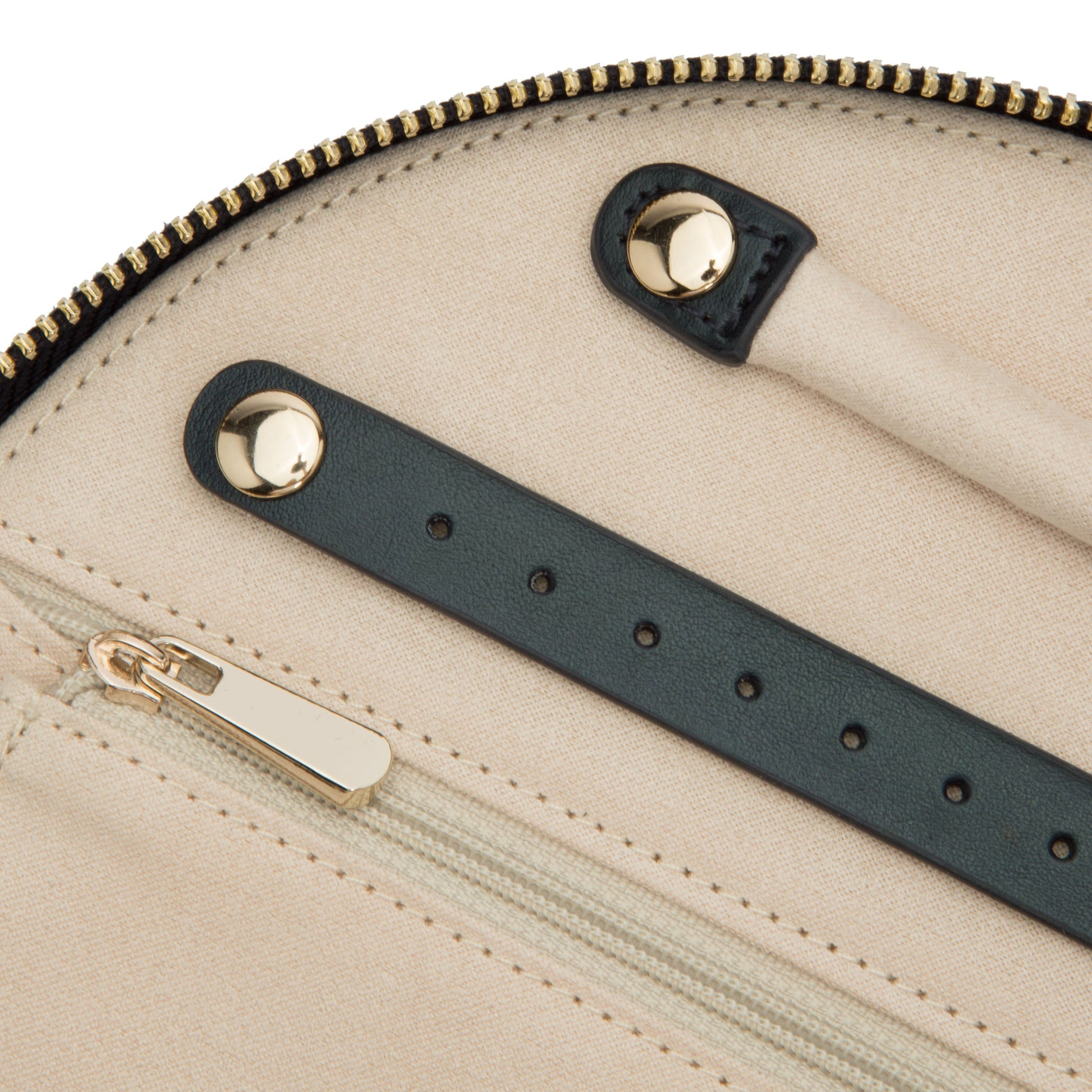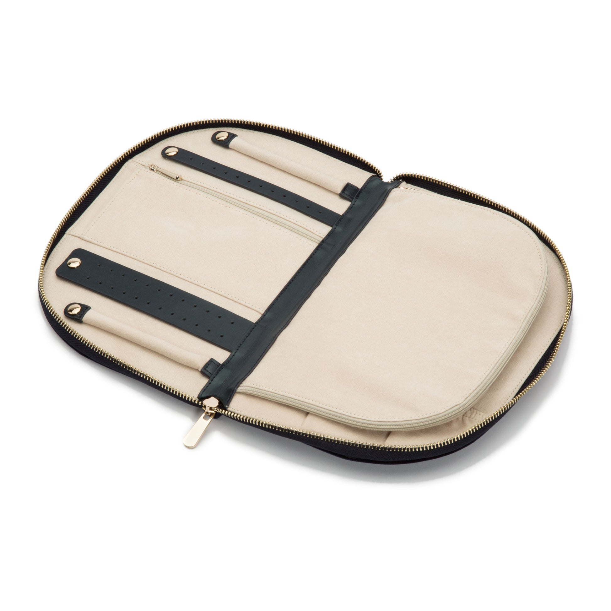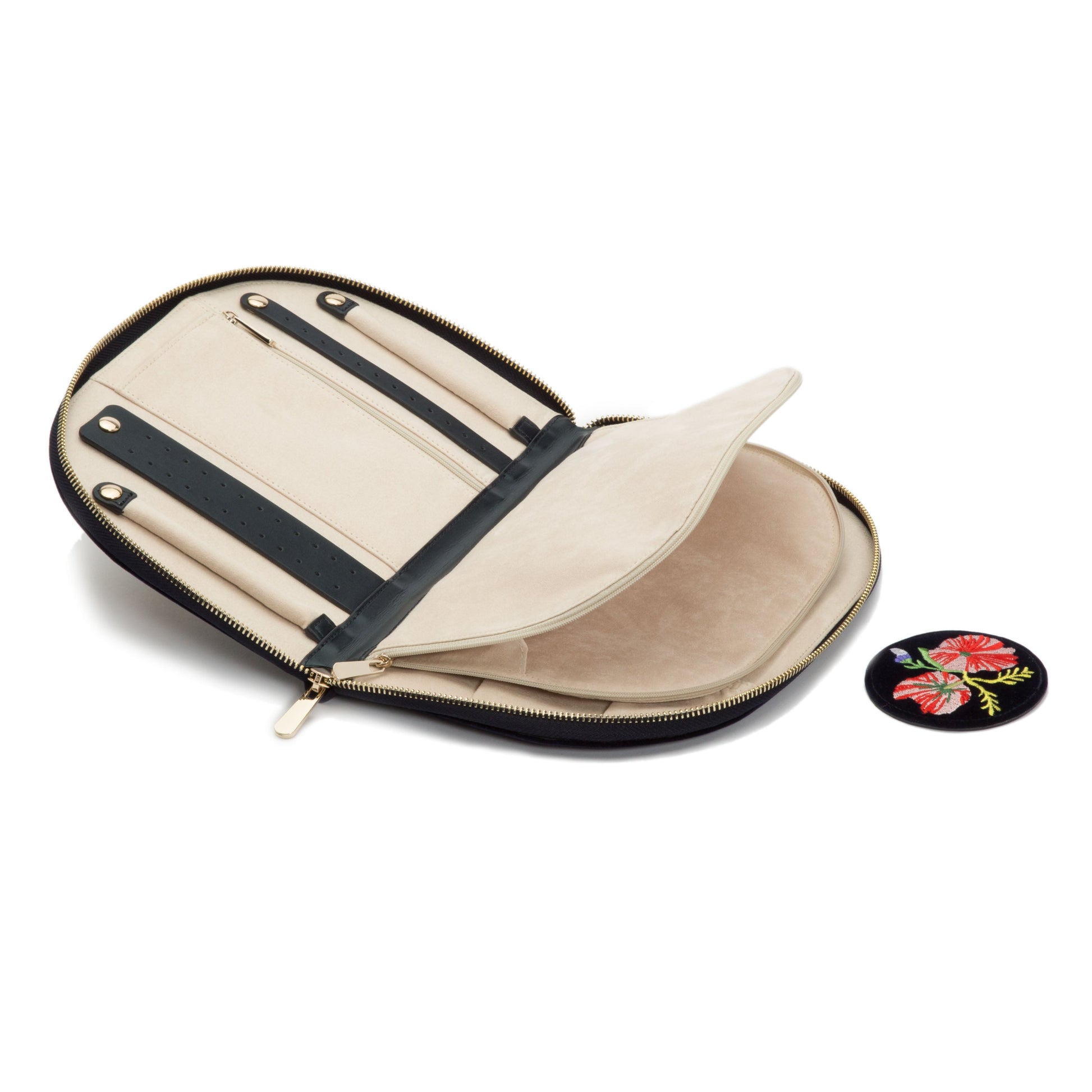 Storage: Earring holder (2), ring roll (2), zip pocket medium (1), zip pocket large (1), necklace holder (4), removable round mirror (1)